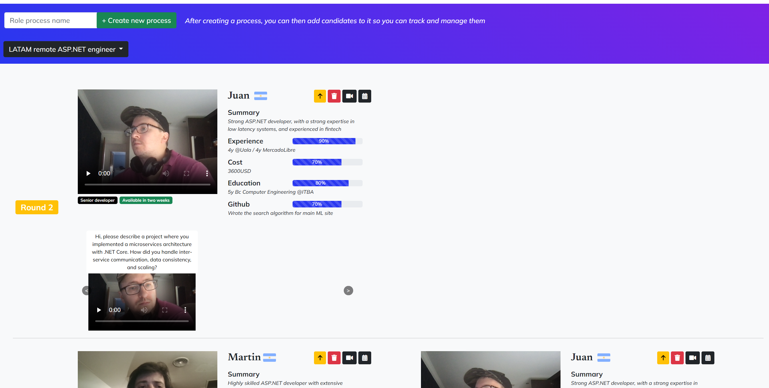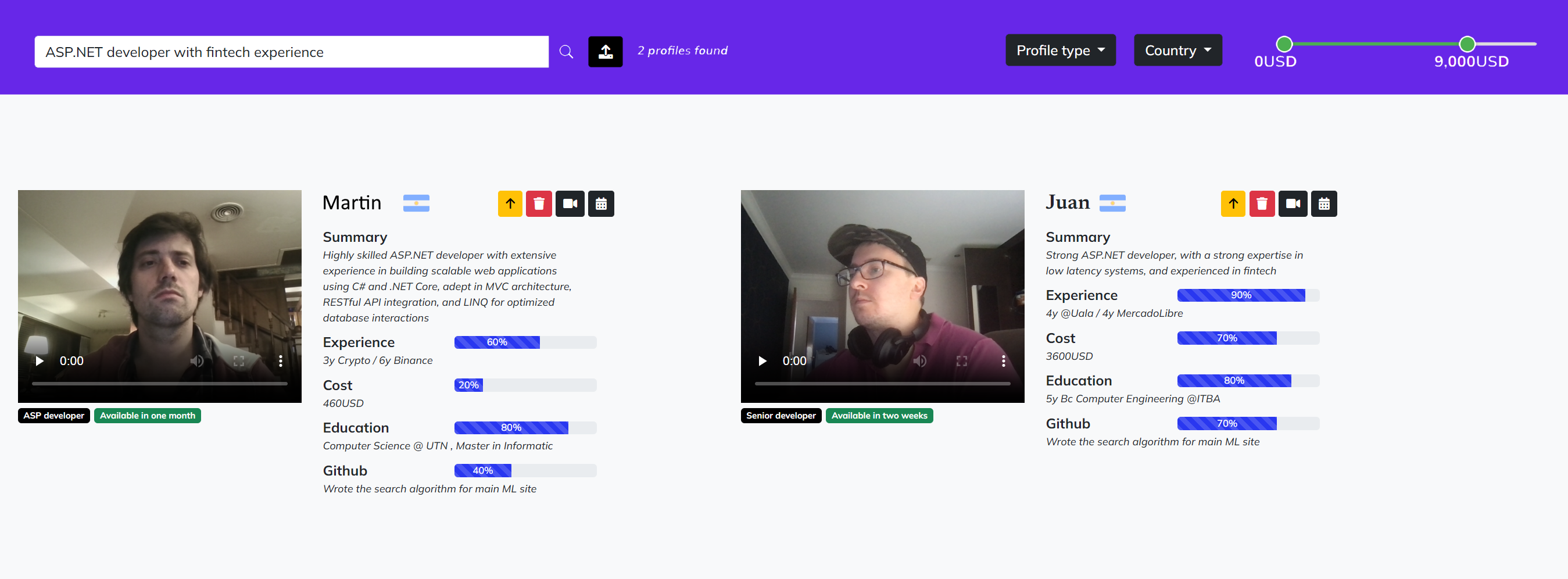 You can hire the best Latam talent in just minutes! With all the information at your fingertips, including resumes, AI summaries, video interviews, and complete profiles, you can quickly and confidently make your hiring decision, significantly reducing recruitment time.